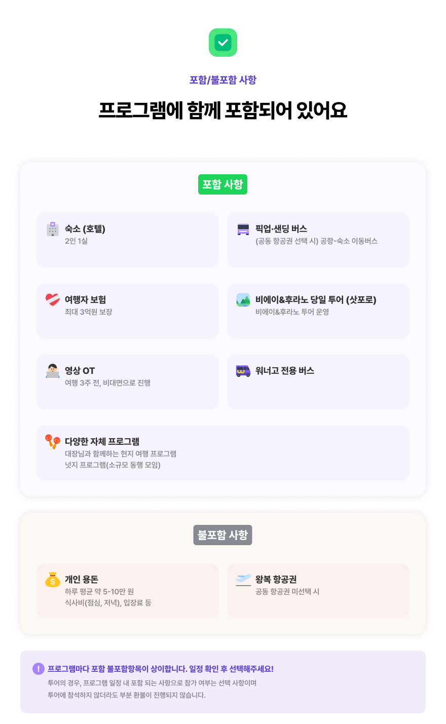 - 워너고트립은 모든 참가자의 건강과 편안한 여행을 위해 노력하고 있습니다. 개인의 건강 상태를 고려해 일정을 조율해 주세요.