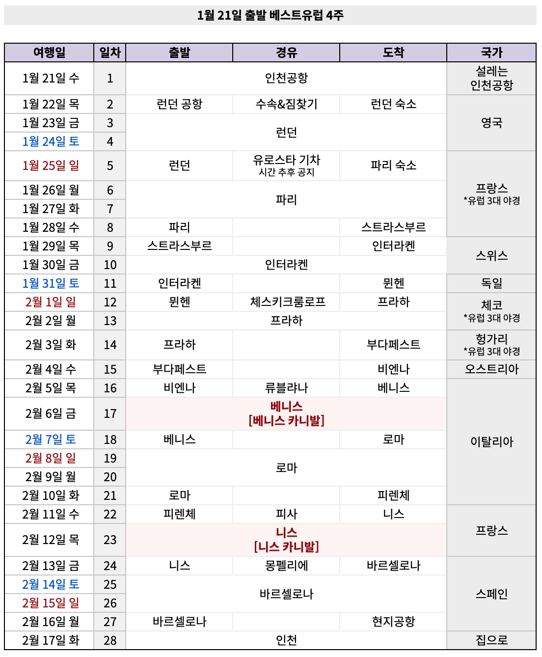 항공 / 숙소 / 유레일 등 별도 변경 및 취소 수수료에 따라 부과