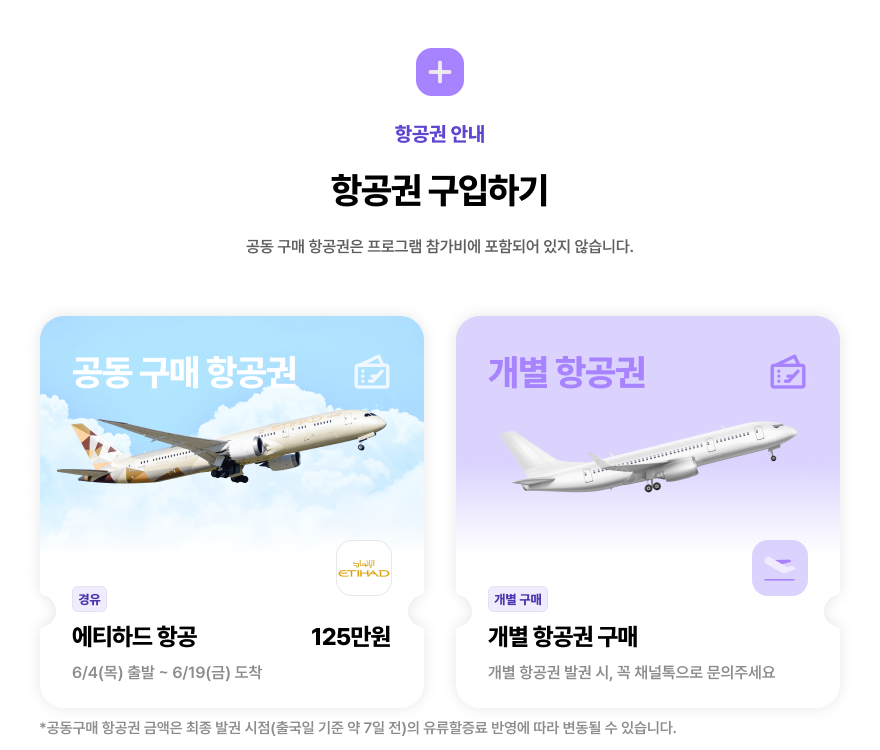 단, 카드 결제의 경우 프로그램비만 결제 가능합니다. 발권대행사를 통해 진행되는 공동구매 항공권은 카드 결제가 불가하며, 현금 결제(가상계좌 1회)로 납부해주시면 됩니다.