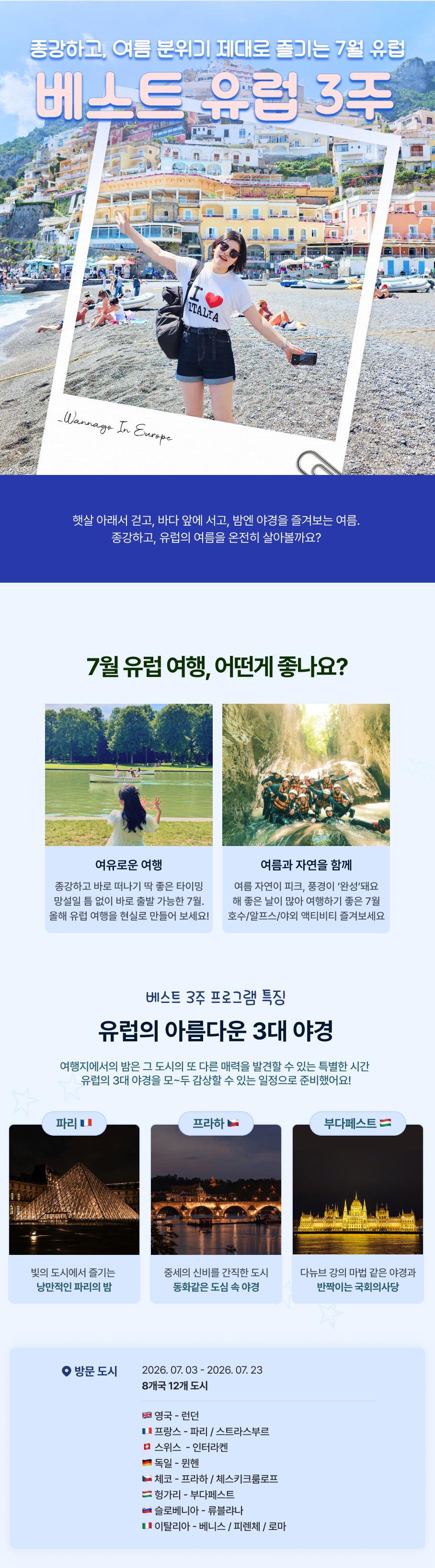 - 프로그램 정원이 모두 모집 되어 프로그램이 마감된 경우, 취소 요청 시점과 관계없이 30일~20일 이전 기준(계약금 환불 불가/위약금 15%/항공, 숙소, 유레일 등 별도 변경 및 취소 수수료 부과)으로 적용됩니다.
