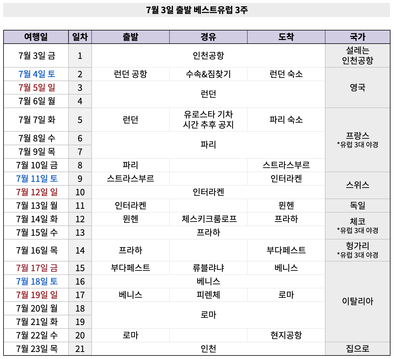 항공 / 숙소 / 유레일 등 별도 변경 및 취소 수수료에 따라 부과