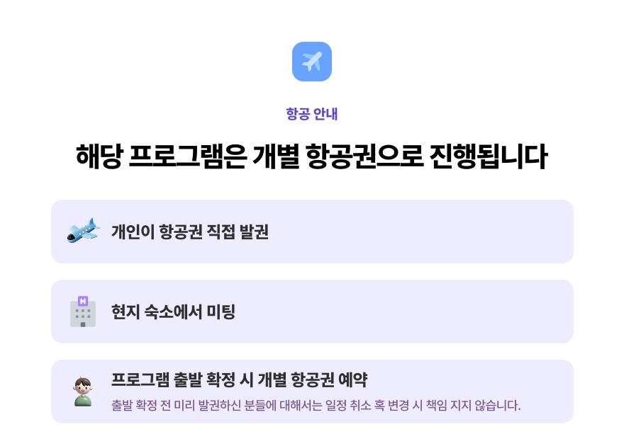 ‼ 개별 항공 진행 시 [공항 ↔ 숙소] 픽업&샌딩 버스는 불포함 항목입니다.