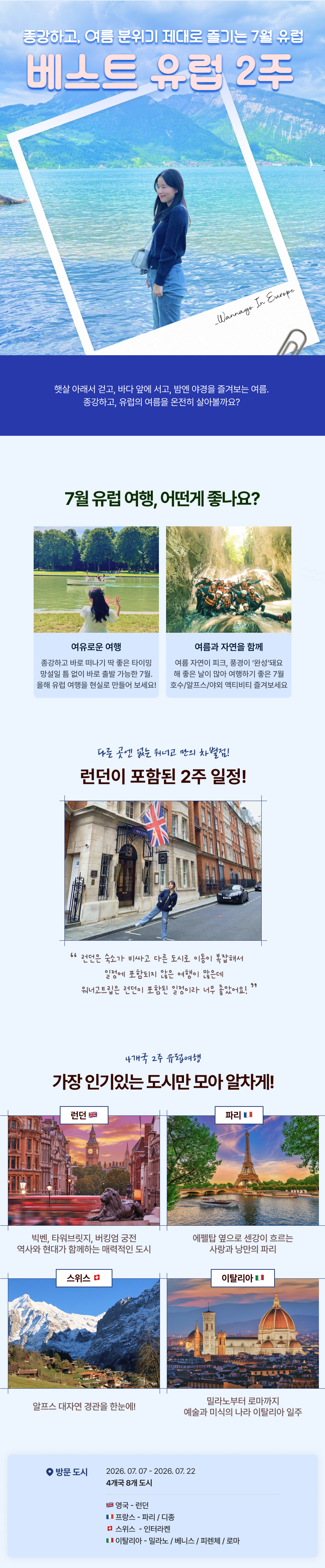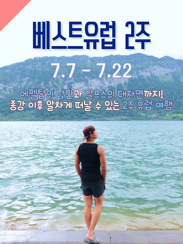 - 프로그램 정원이 모두 모집 되어 프로그램이 마감된 경우, 취소 요청 시점과 관계없이 30일~20일 이전 기준(계약금 환불 불가/위약금 15%/항공, 숙소, 유레일 등 별도 변경 및 취소 수수료 부과)으로 적용됩니다.