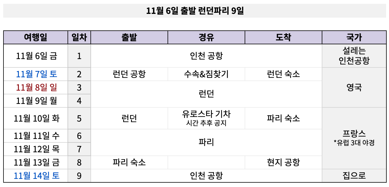 항공 / 숙소 / 유레일 등 별도 변경 및 취소 수수료에 따라 부과