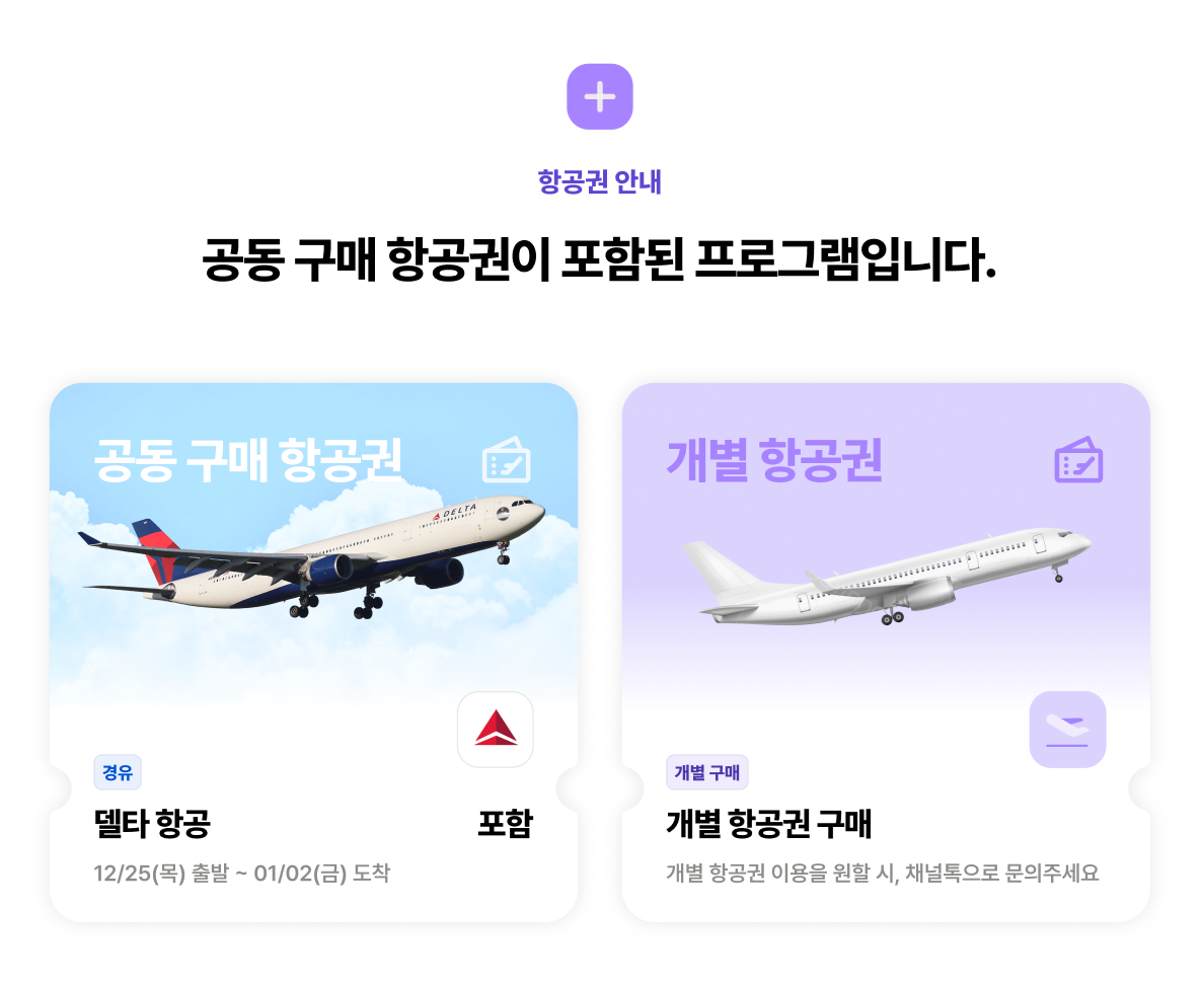 단, 카드 결제의 경우 프로그램비만 결제 가능합니다. 발권대행사를 통해 진행되는 공동구매 항공권은 카드 결제가 불가하며, 현금 결제(가상계좌 1회)로 납부해주시면 됩니다.