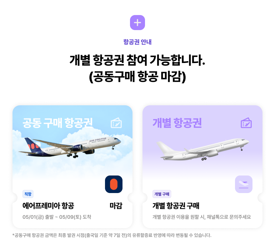 신청 전 팀공지페이지에서 공동구매 항공 일정을 꼭! 확인 후 팀공지페이지를 통해 신청 해주세요!