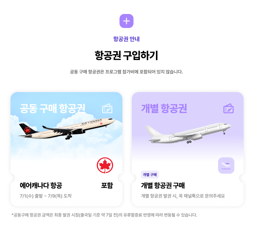 단, 카드 결제의 경우 프로그램비만 결제 가능합니다. 발권대행사를 통해 진행되는 공동구매 항공권은 카드 결제가 불가하며, 현금 결제(가상계좌 1회)로 납부해주시면 됩니다.