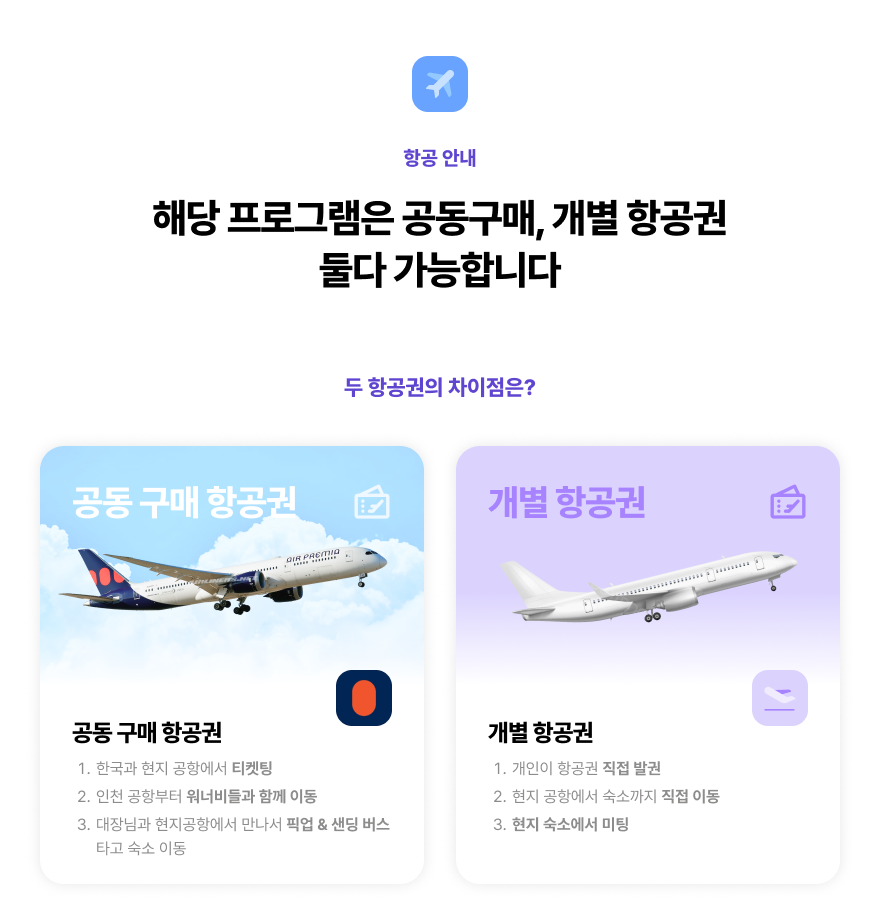 ‼ 개별 항공 진행 시 [공항 ↔ 숙소] 픽업&샌딩 버스는 불포함 항목입니다.
