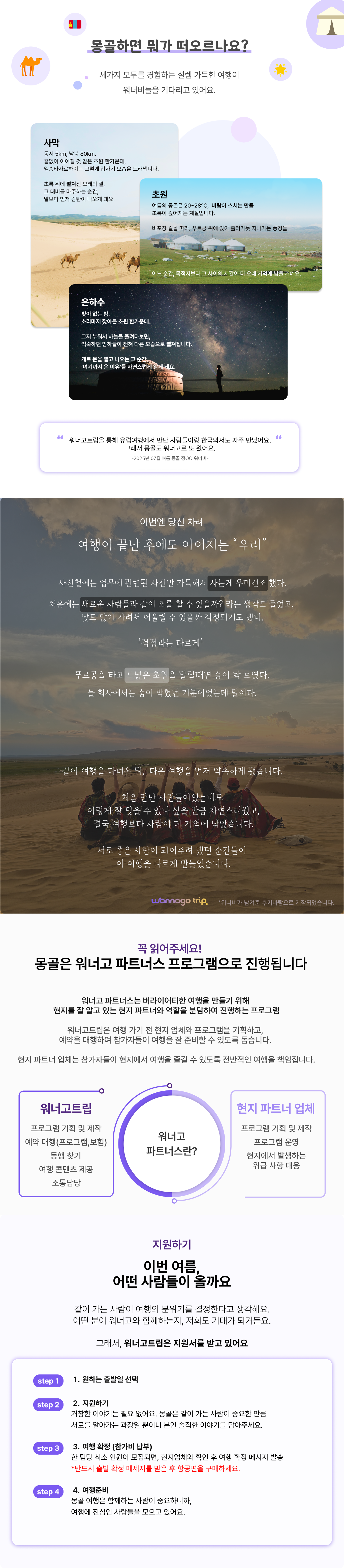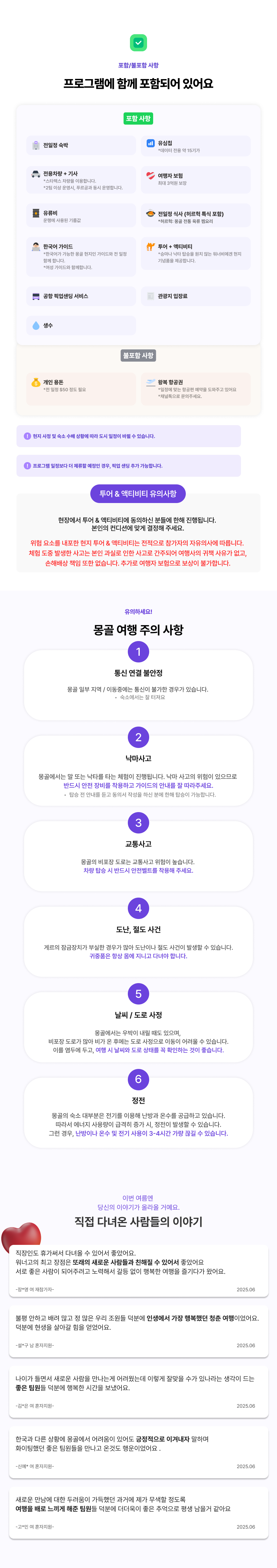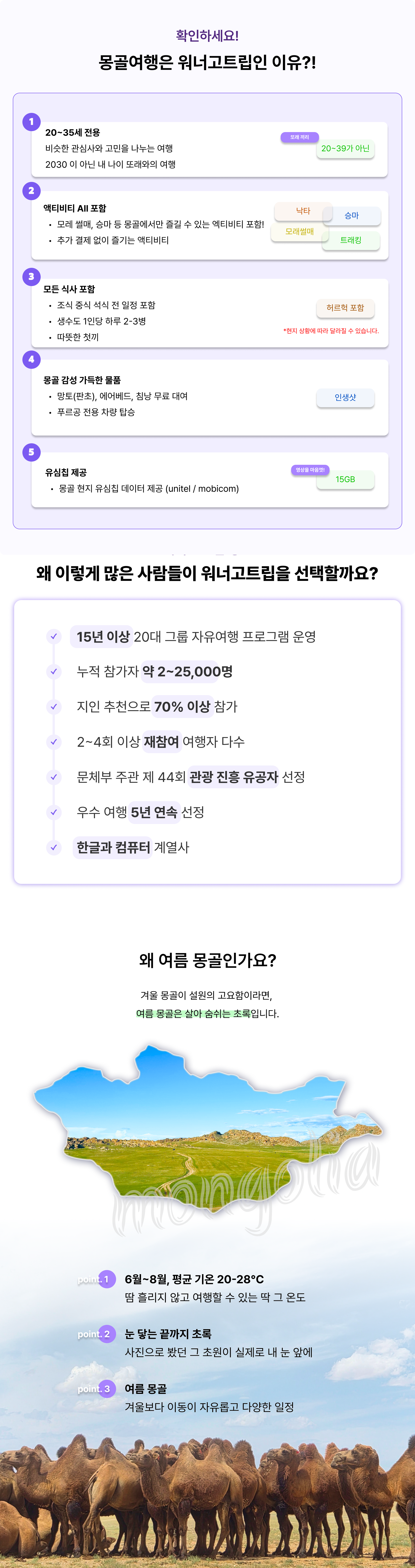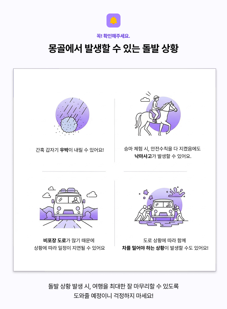 * 현재 여름 몽골 지원자가 많아 안내드립니다. 지원 현황은 실시간 적용이 아니며, 출발 확정 시 추천항공편 링크와 함께 메세지가 발송됩니다.꼭, 해당 메세지 수령하신 이후 항공권을 구매해주세요:)