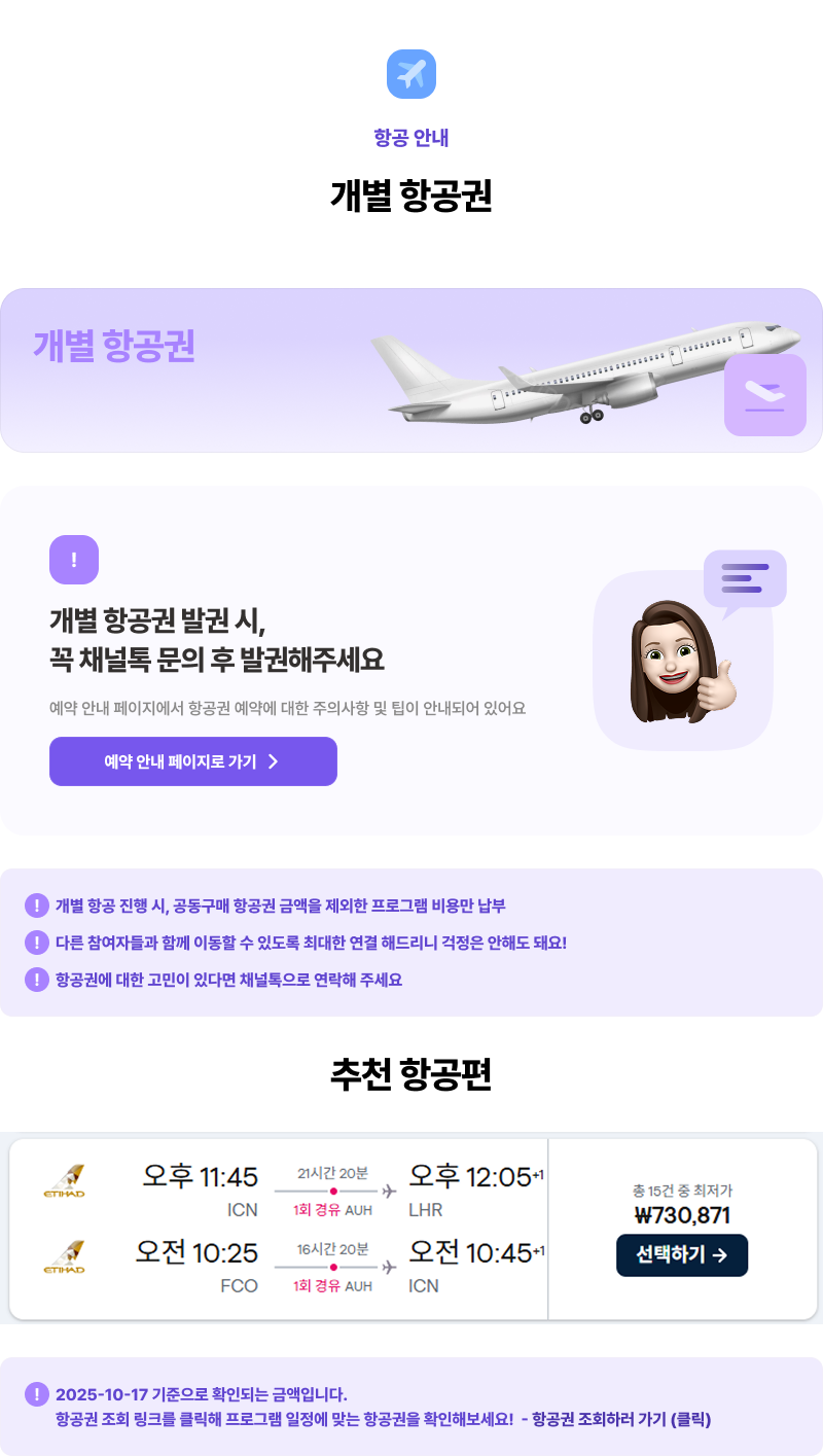 📌 개별항공 이용을 원하신다면 워너고트립 호기심센터로 문의주세요!