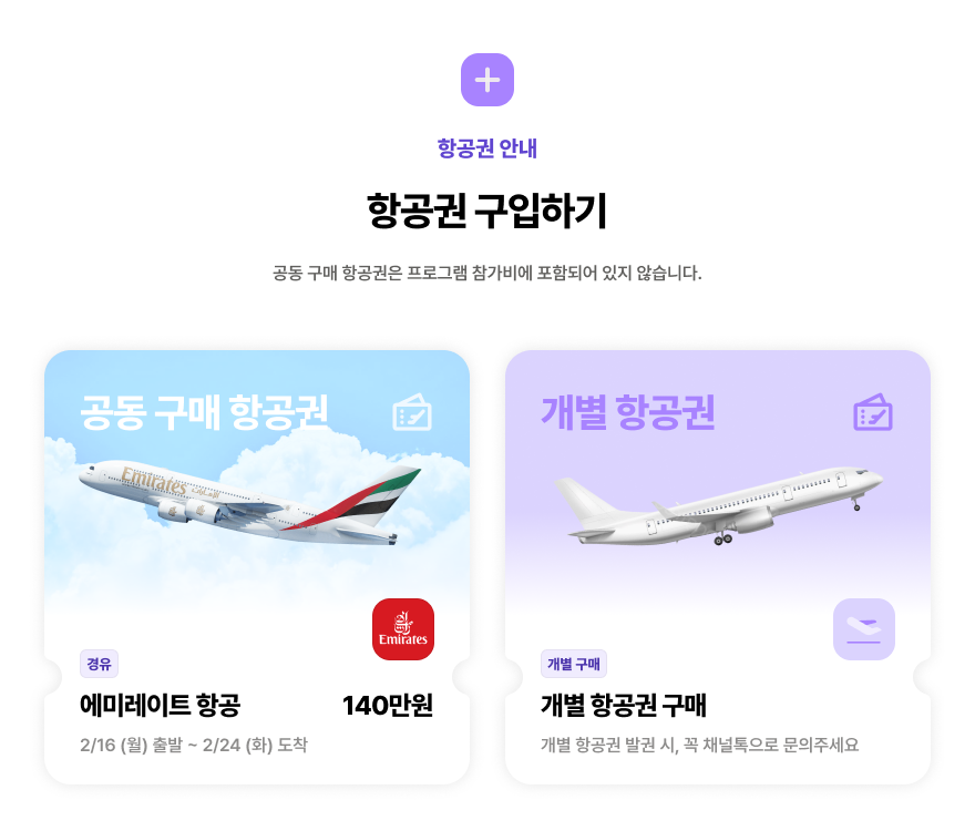 단, 카드 결제의 경우 프로그램비만 결제 가능합니다. 발권대행사를 통해 진행되는 공동구매 항공권은 카드 결제가 불가하며, 현금 결제(가상계좌 1회)로 납부해주시면 됩니다.