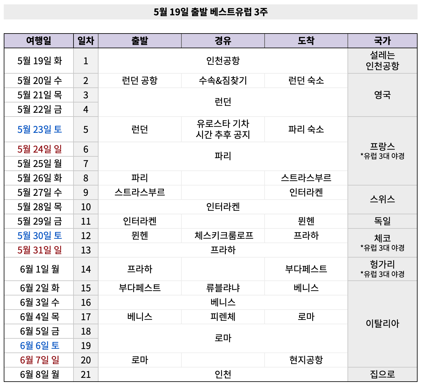 항공 / 숙소 / 유레일 등 별도 변경 및 취소 수수료에 따라 부과